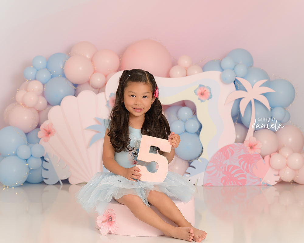 This pastel beach arch backdrop features soft pink and blue balloons, tropical palms, and whimsical seashells for a dreamy island-inspired setup. Perfect for cake smash sessions, birthday portraits, and summer-themed photo shoots.