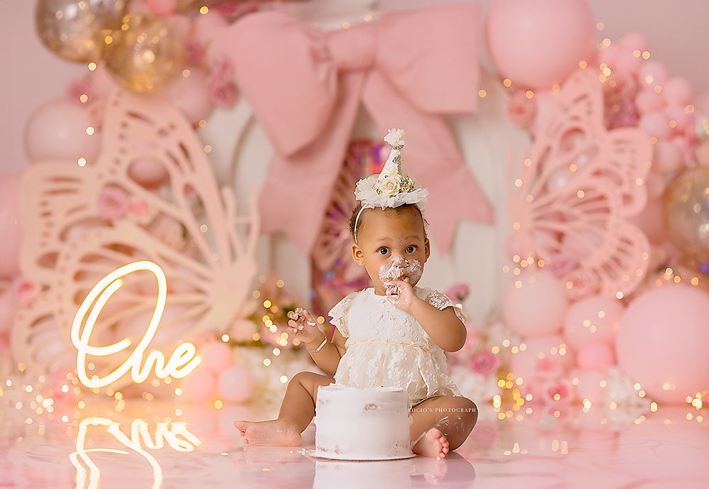 search words: pink butterfly wings 1st birthday, first birthday, cake smash girl background