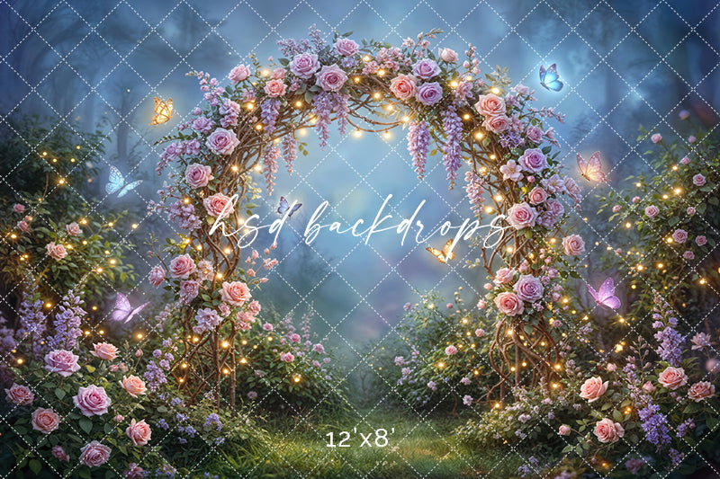 Twilight Fairy Garden Floral Arch Photography Backdrop – Enchanted Rose Arbor Scene | HSD Backdrops