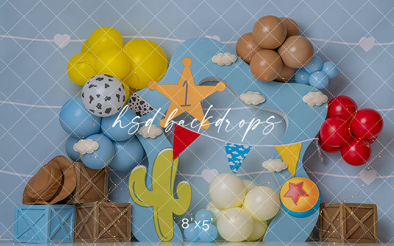Wild West One cowboy first birthday cake smash backdrop with balloons and cacti.