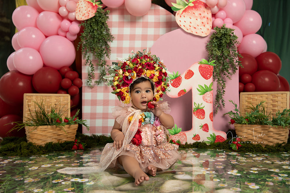 search words: strawberry, cake smash girl, berry 1st birthday, photo background