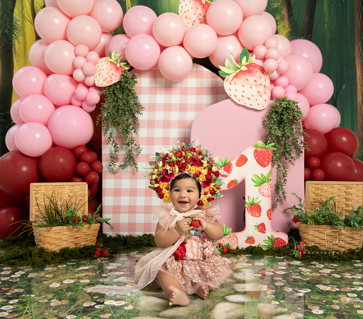 Strawberry Patch Party is a vibrant and playful backdrop featuring pink and red balloon garlands, gingham panels, oversized strawberries, and picnic-style props. Perfect for strawberry-themed cake smashes, first birthdays, and spring photo sessions, this sweet setup adds charm and color to every celebration.