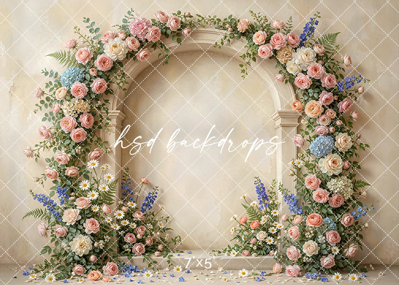 The Blush Garden Floral Arch Photography Backdrop features a classic architectural arch adorned with cascading blush roses, soft ivory blooms, delicate daisies, and touches of blue florals set against a warm neutral wall. This romantic spring design creates a timeless setting perfect for Mother’s Day portraits, maternity sessions, and fine art portrait photography. The soft blush tones, layered florals, and airy styling add depth and elegance while keeping the focus beautifully on your subject.
