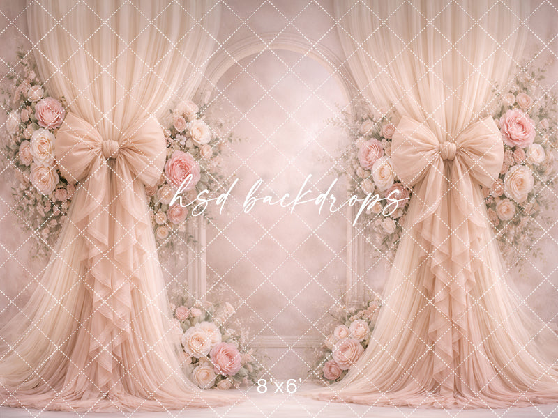 Dusty blush rose bow photography backdrop with romantic neutral drapery and floral arch for elegant portrait sessions.