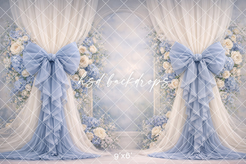Soft blue rose bow photography backdrop with elegant floral arch and flowing draped curtains for romantic portrait sessions.