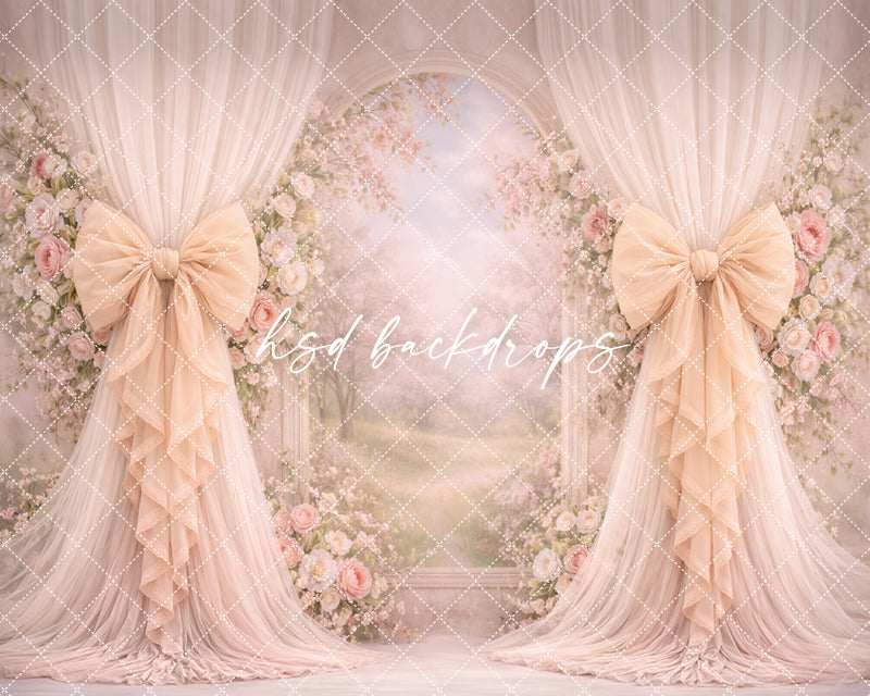 Warm Blush Floral Arch Bow Photography Backdrop – Elegant Garden Portrait Scene | HSD Backdrops