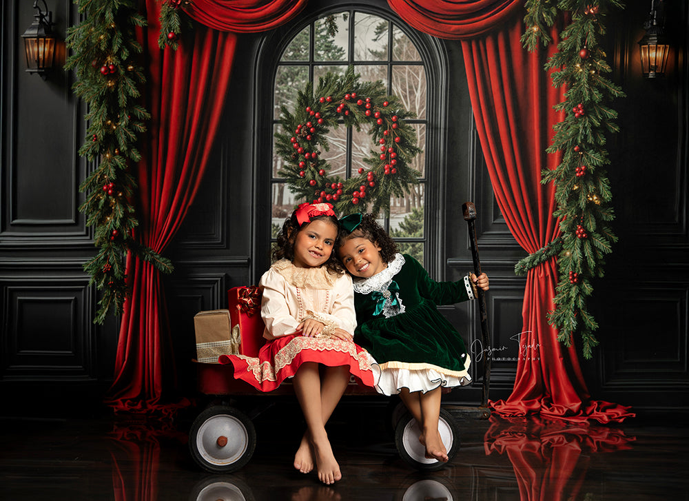 search words: winter, holiday, black wainscot wall, Christmas window photo background