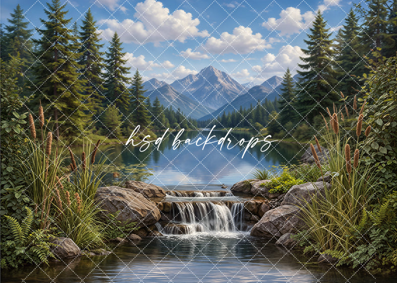 The Mountain Lake Fishing Photography Backdrop features a peaceful lake surrounded by pine trees, mountain views, and a gentle flowing waterfall in the foreground. This outdoor-inspired scene creates the perfect setting for fishing mini sessions, summer portraits, and nature-themed photography. The calm water, natural greenery, and scenic depth create a realistic environment ideal for storytelling and capturing outdoor moments.
