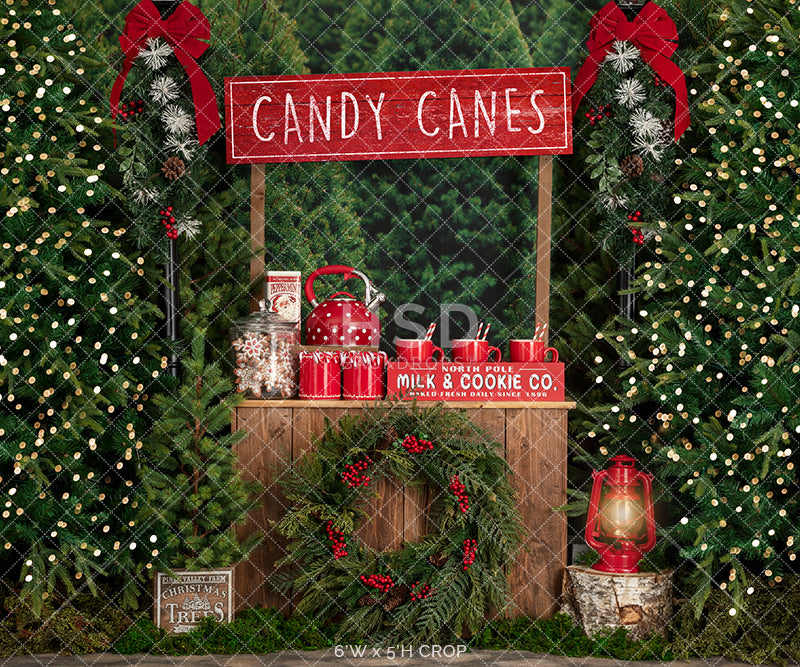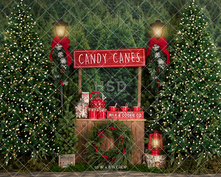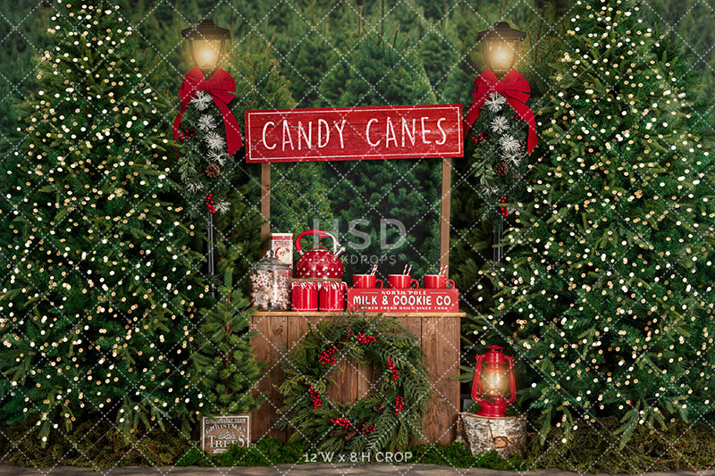 search words: winter, holiday, Christmas tree farm, hot cocoa stand, candy cane stand, Christmas picture background