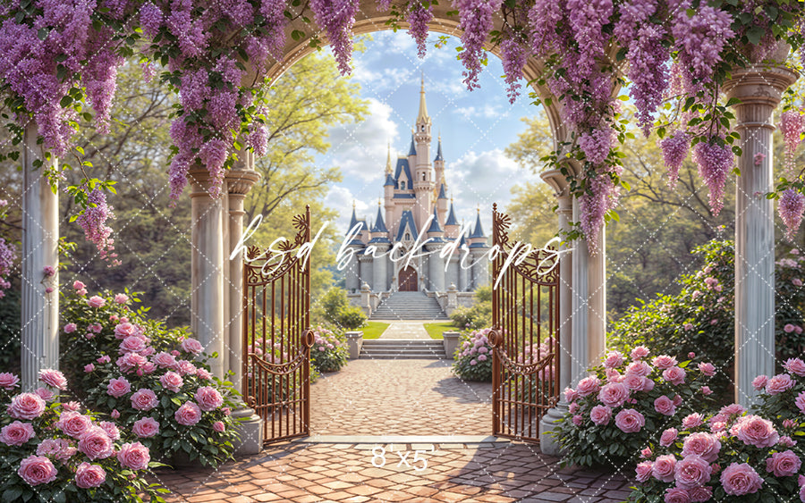 Castle Garden Entrance backdrop with roses, wisteria, columns, and castle path