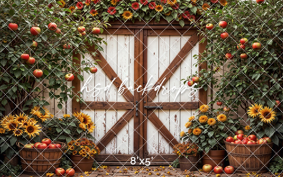 search words: fall, autumn, apple trees, barn doors, apple orchard photo backdrop