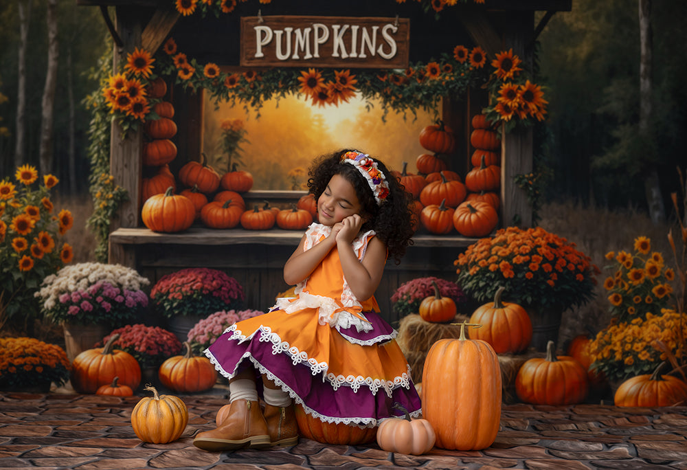 Celebrate the cozy charm of autumn with our Golden Hour Pumpkin Stand backdrop. Overflowing with pumpkins, sunflowers, and vibrant mums, this fall photo scene is perfect for seasonal minis, family portraits, and festive farm-style setups.