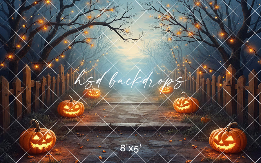 Step into a glowing Halloween night with this enchanting backdrop, featuring carved jack-o'-lanterns, a cobblestone path, and twinkling lights draped through eerie, leafless trees. Perfect for spooky photo sessions, trick-or-treat minis, or fall portrait setups.