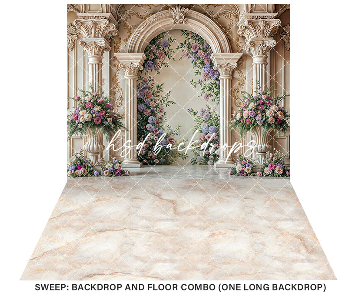 search words: arched wall, elegant columns, victorian, purple floral, baroque, vintage, photo background