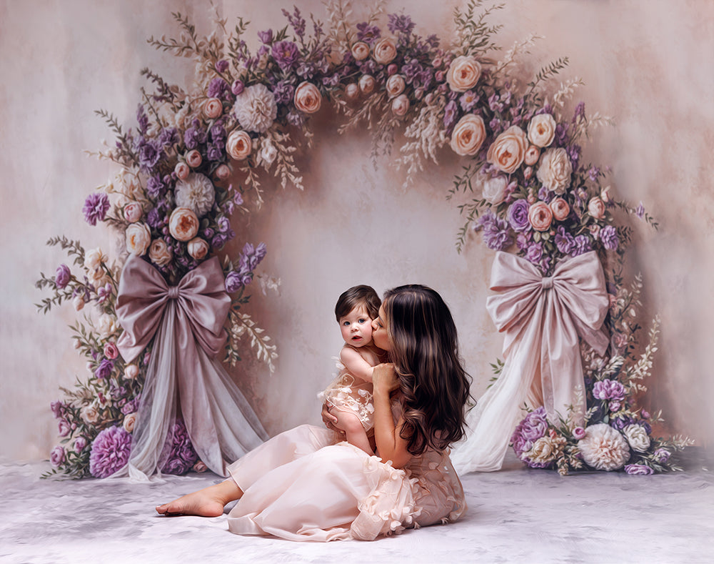 search words: spring, large purple bow, flowers, Mother's Day, floral arch wall photo backdrop