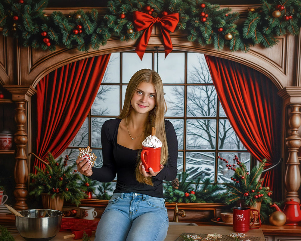 search words: winter, rustic white farmhouse Christmas kitchen photo background