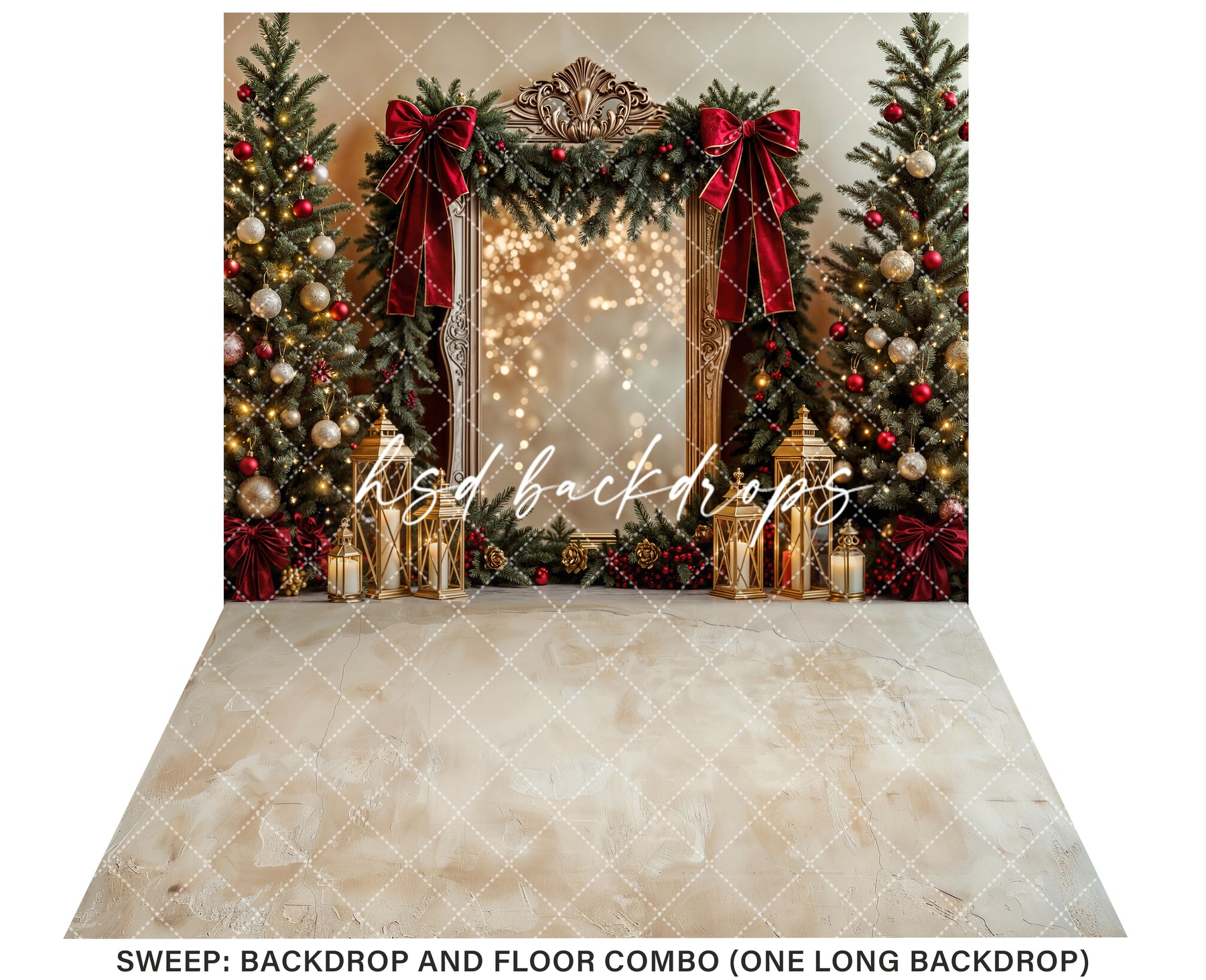 The Velvet Crimson Gilded Frame backdrop showcases classic Christmas elegance with deep red velvet bows, golden lanterns, and festive evergreen trees surrounding a regal gilded frame. This timeless setup is perfect for capturing warm, magical holiday portraits.