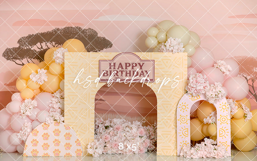 search words: pink safari, 1st birthday, first, balloon garland, cake smash girl background