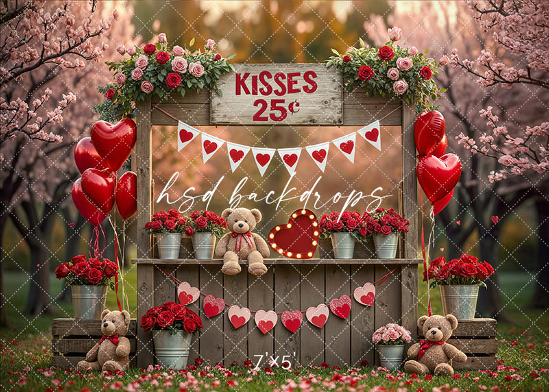 Capture pure charm with the Kisses Booth – Valentine’s Day Photo Background. This adorable setup features a rustic wood stand adorned with red roses, heart banners, and teddy bears for that irresistible “25¢ kisses” feel. Perfect for children’s portraits and mini sessions, it’s a heartwarming favorite for Valentine’s season photography.