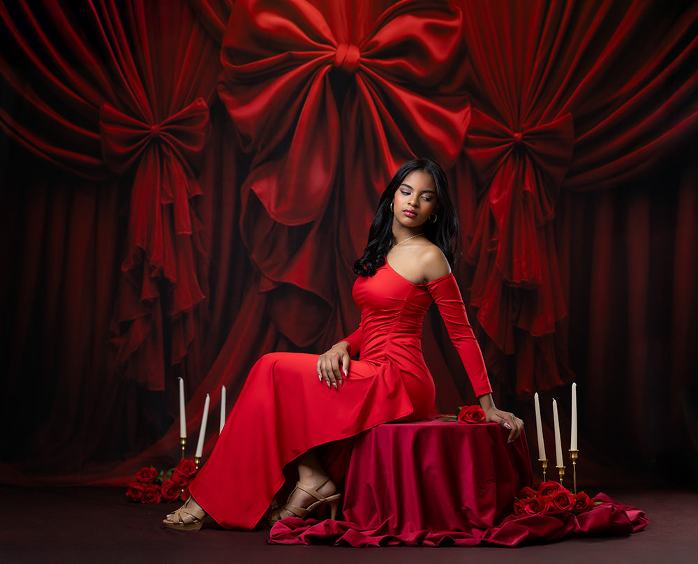 Turn up the romance with the Scarlet Satin Bow – Red Draped Fabric Photography Backdrop. This luxurious red backdrop features cascading satin-style drapery gathered into elegant bows, creating a rich and dramatic scene that’s perfect for Valentine’s Day, boudoir, or fine art portraits. Its bold color and refined texture bring instant sophistication to any photo session or event setup.