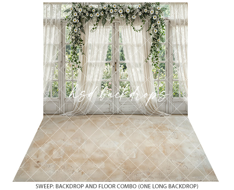 Welcome spring elegance into your studio with the Daisy Garden Manor Window – Elegant Spring Backdrop, featuring a vintage manor-style window draped in soft ivory curtains and lush greenery. A cascading arrangement of cheerful white daisies and delicate foliage frames the bright outdoor garden view, creating a fresh, romantic atmosphere ideal for spring minis, fine-art portraits, maternity sessions, and bridal photography. The airy light, soft textures, and timeless floral detailing make this backdrop a beautiful choice for elevating any spring photoshoot.