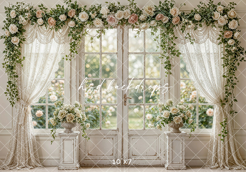 Elevate your spring portraits with the Rose Garden Manor Window – Elegant Spring Backdrop, featuring cascading blush and ivory roses draped over a grand vintage window. Soft lace curtains, lush greenery, and romantic floral arrangements frame a glowing garden view, creating a timeless and luxurious setting for fine-art portraits, spring minis, maternity sessions, and bridal photography. This refined, classic design adds depth, elegance, and gentle floral charm to every photoshoot.