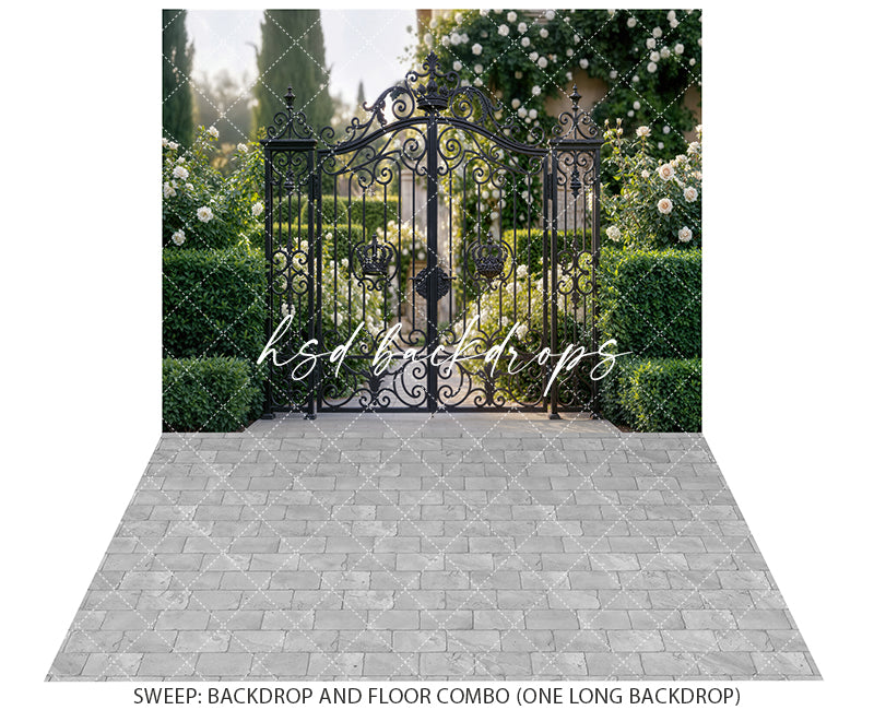 search words: Royal garden gate backdrop, wrought iron gate photography scene, floral garden portrait background, European estate photo setting, quinceañera backdrop, maternity photography background, Mother’s Day photo backdrop, fine art floral backdrop.