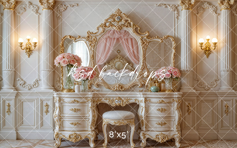 Princess Vanity Room backdrop with gold vanity, pink roses, and ornate mirrors