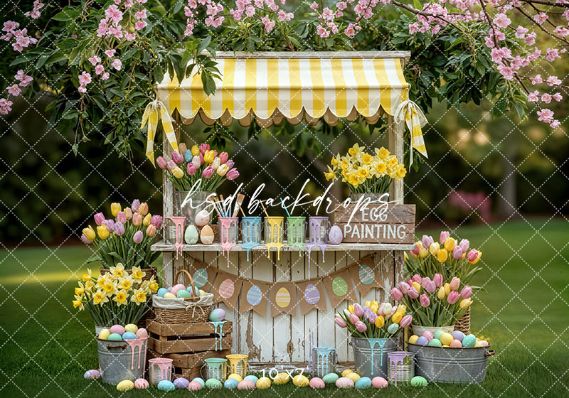 Celebrate spring creativity with the Easter Paint & Petals Photography Backdrop! This playful setup features a white wood stand decorated with pastel tulips, daffodils, Easter eggs, and bright yellow paint cans under a cheerful striped canopy. Ideal for Easter minis, spring portraits, and children’s photography, it brings pure seasonal joy to your setup.