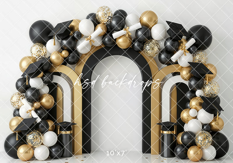 Black gold graduation arch photography backdrop with black, white, and gold balloons, graduation caps, diplomas, and layered arch details for formal portrait photography.